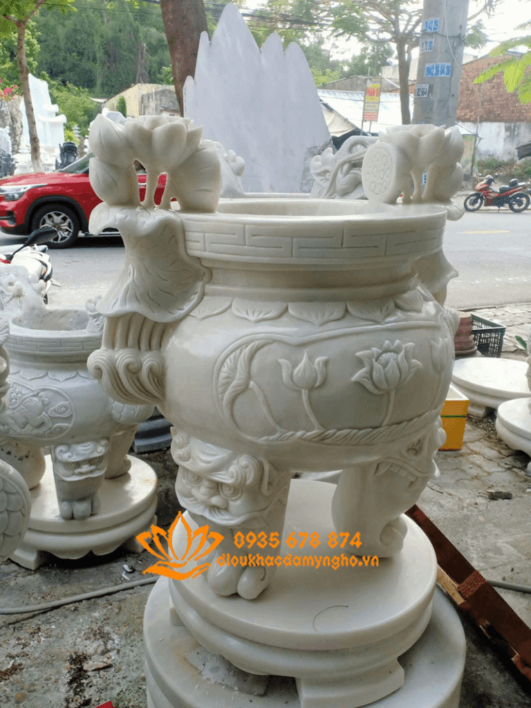 Lư Hương Đá Chạm khắc Hoa Sen bằng đá trắng mịn